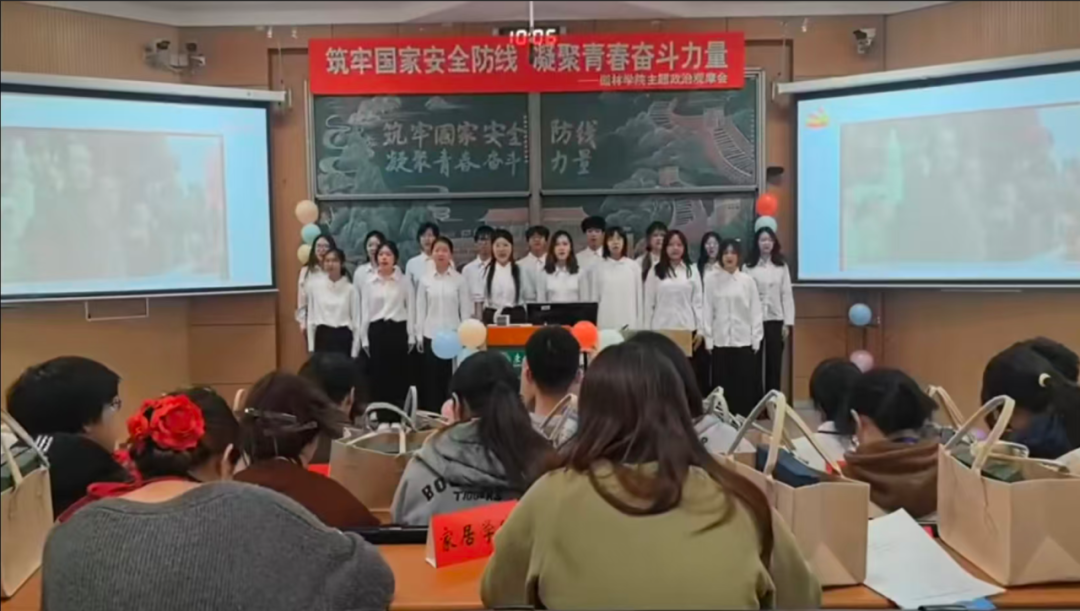 台上合唱、朗诵、微电影皆是“学理论再登台”的例子,台下同学观节目悟理论、践使命,形成带动氛围。