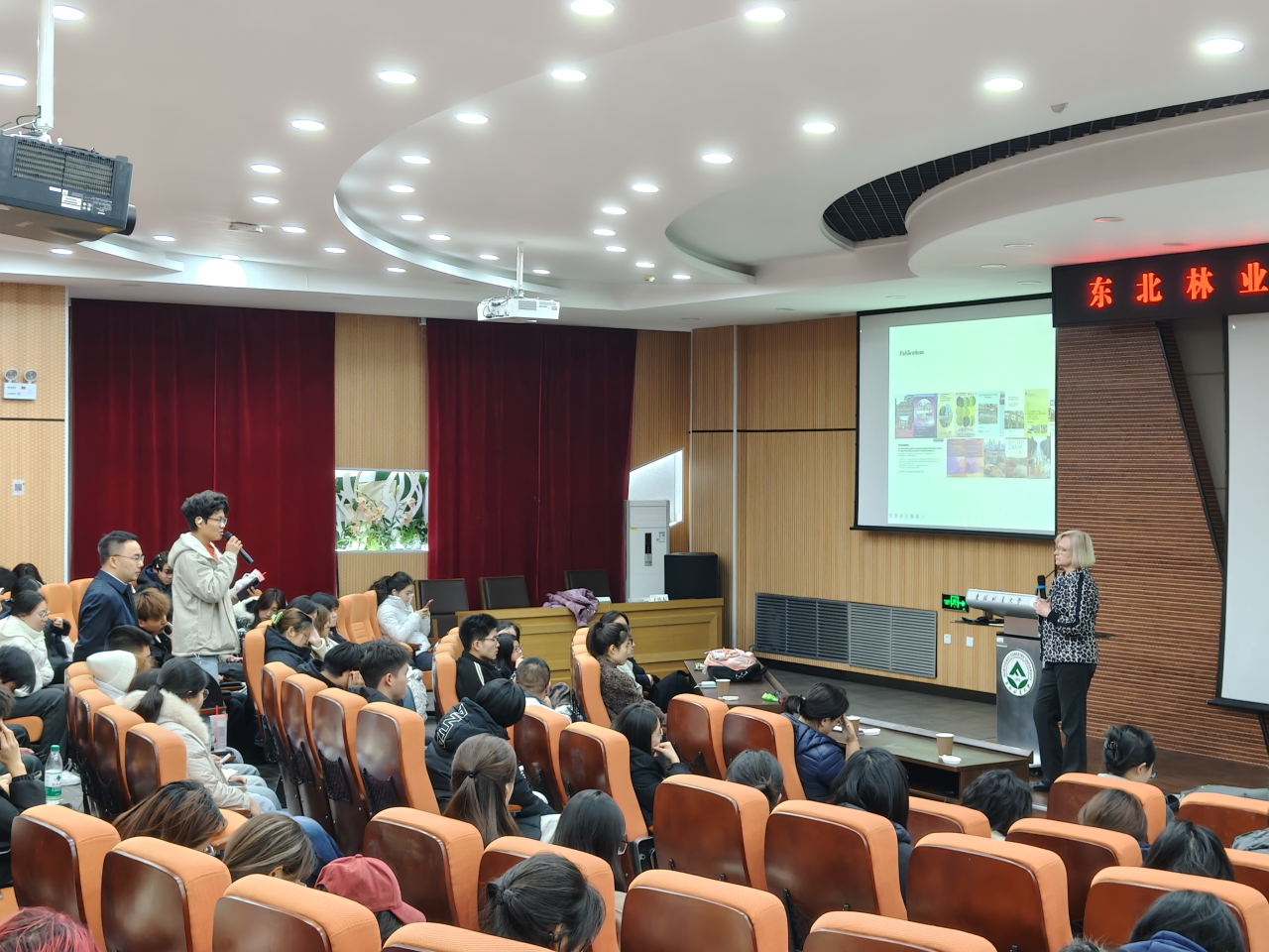 在讲座的最后部分,Maria教授对风景园林行业的未来发展提出了中肯的建议与思考。他呼吁从业者和教育者需具备更广阔的跨学科视野,拥抱新技术,并始终将生态伦理与社会责任置于首位。现场气氛活跃,听众们争相提问。大家就“成为一名景观设计师需要具备哪些核心能力?”以及“我们如何应用植物设计来具体应对气候变化?”等实际问题与教授进行了深入探讨。教授一一予以详细解答,强调了持续学习、沟通协作、生态知识以及创造性思维的重要性,并就植物在固碳释氧、调节微气候、构建生态廊道等方面的具体应用提供了专业见解。
