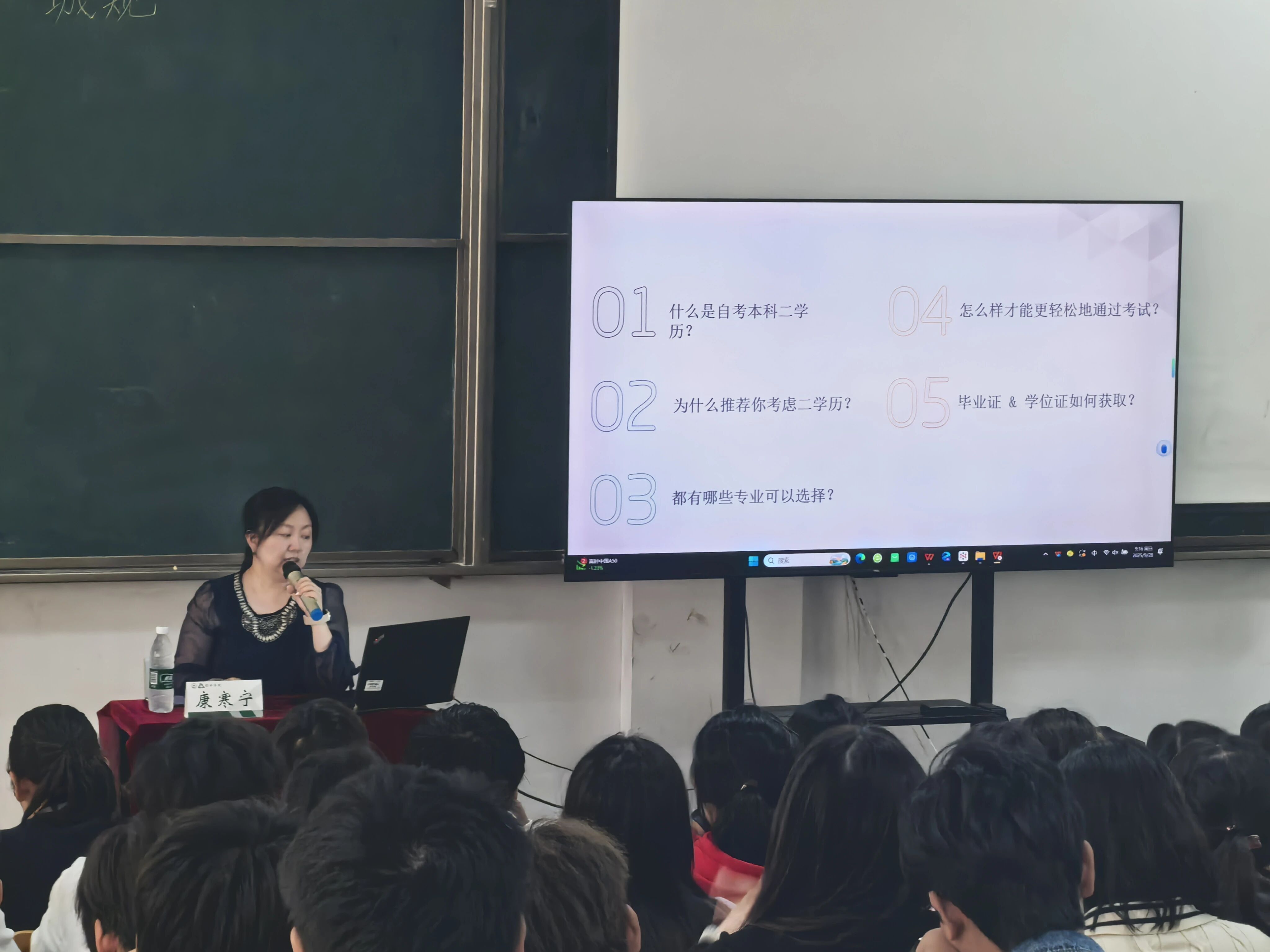 9月28日上午,学院邀请到我校继续教育学院自学考试科负责人康寒宁老师为本科生新生们讲解“自考本科二学历”的相关内容。课堂上,康老师主要围绕“什么是自考本科二学历”“为什么推荐大家申请二学历”“二学历开设专业”“如何学习并获取二学历的毕业证及学位证”等内容进行展开。课堂上,同学们认真倾听并做好记录,互动环节康老师也耐心解答同学们的疑问。最后,康老师也提醒同学们要主动打破专业壁垒,“多一个选择 多N个可能”,用双倍的努力换取无限的可能,提升综合素质能力,逐渐锻炼成符合社会需要、适应时代发展的复合型园林青年!