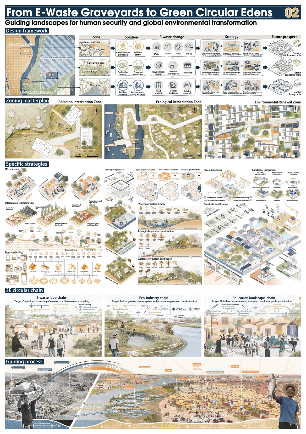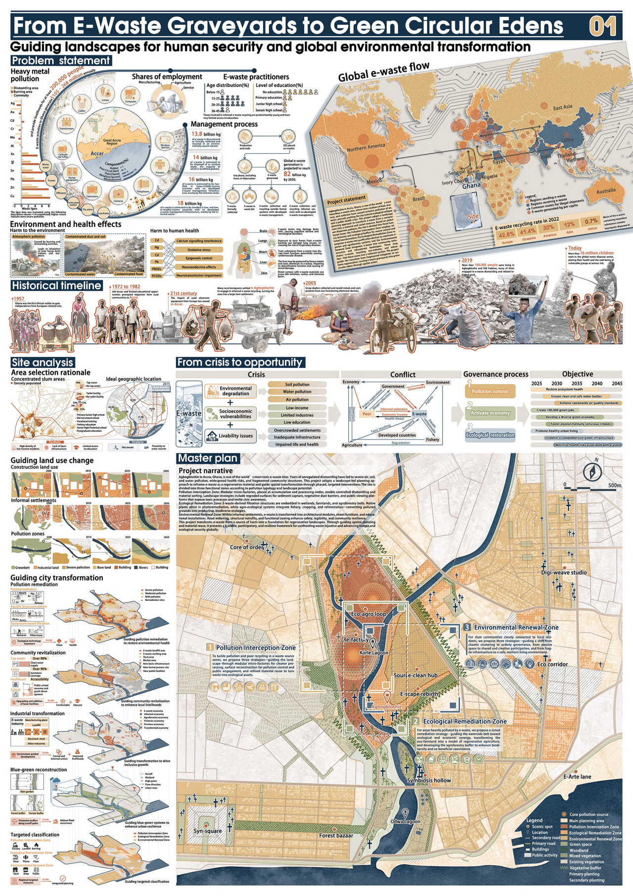我校获奖作品《From E-Waste Graveyards to Green Circular Edens》由王蕾教授、许大为教授、刘炳熙老师担任指导教师。作品针对加纳阿博布罗西地区因电子垃圾非正规回收所带来的严重环境污染、公众健康危机及产业转型困境,提出了基于风景园林视角以城市“3E循环链”为核心的系统性解决方案。根据场地特征,方案将区域分为污染拦截区、生态恢复区、环境修复区,并分别建立电子垃圾循环链(E-Waste Loop Chain)、生态产业链(Eco-Industry Chain)与教育景观链(Education Landscape Chain)。通过分区治理策略,实现经济转型、环境修复与社会公平三大目标,引导加纳阿博布罗西地区从电子垃圾坟场,转型为集“电子垃圾可持续-生态产物正循环-社区教育新赋能”于一体的绿色循环伊甸园,为全球同类环境的电子垃圾绿色转型提供可推广的实践路径。
