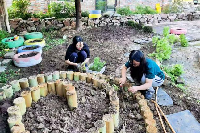 团队始终坚持 “共建共治共享” 理念,全程邀请村民参与花园建设。从最初的场地勘测,队员们与村民一同丈量地块、分析土壤条件;到选苗栽植阶段,结合村民的种植经验选择适配本地气候的植物;再到亲手铺设碎石步道和休闲平台,村民们积极参与其中,贡献智慧与力量。此外,团队还举办多场园艺疗愈体验工作坊,教村民修剪枝叶、制作干花书签,邀请大家共同参与花园的创作与长期维护。花园建成后,已成为村民日常休憩交流、儿童自然教育及田园康养活动的重要场所,真正实现了设计为人、成果惠众、社区共享的初衷,显著增强了村民的归属感和幸福感。