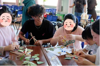 在触觉体验环节,学院准备了由木头、羽毛、棉花等天然材料制成的感官触觉盒,让孩子们触摸并表达感受。随后,孩子们参与黏土制作活动,为树叶添加表情,制作充满童趣的“树叶小怪兽”,在动手过程中增强对自然材质的感知。
